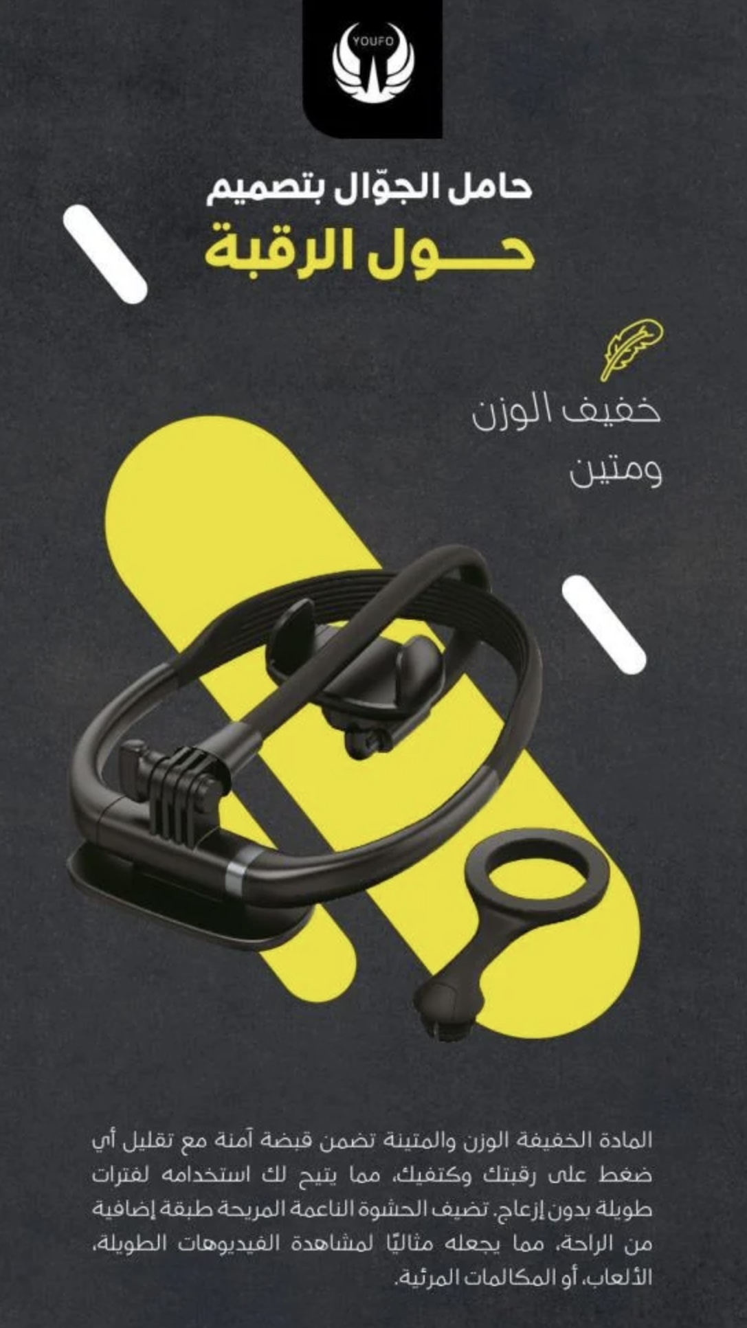 حامل الجوّال حول الرقبة من YOUFO هو ملحق مبتكر يوفر الراحة والحرية في استخدام الجوّال بدون استخدام اليدين في حياتك اليومية. مع تصميمه الفريد، يحمل هذا الحامل الجوّال بثبات، مما يتيح لك مشاهدة الفيديوهات، إجراء المكالمات المرئية، أو اتباع الوصفات بسهولة دون الحاجة لحمل جوّالك باستمرار.